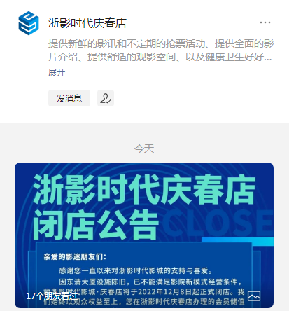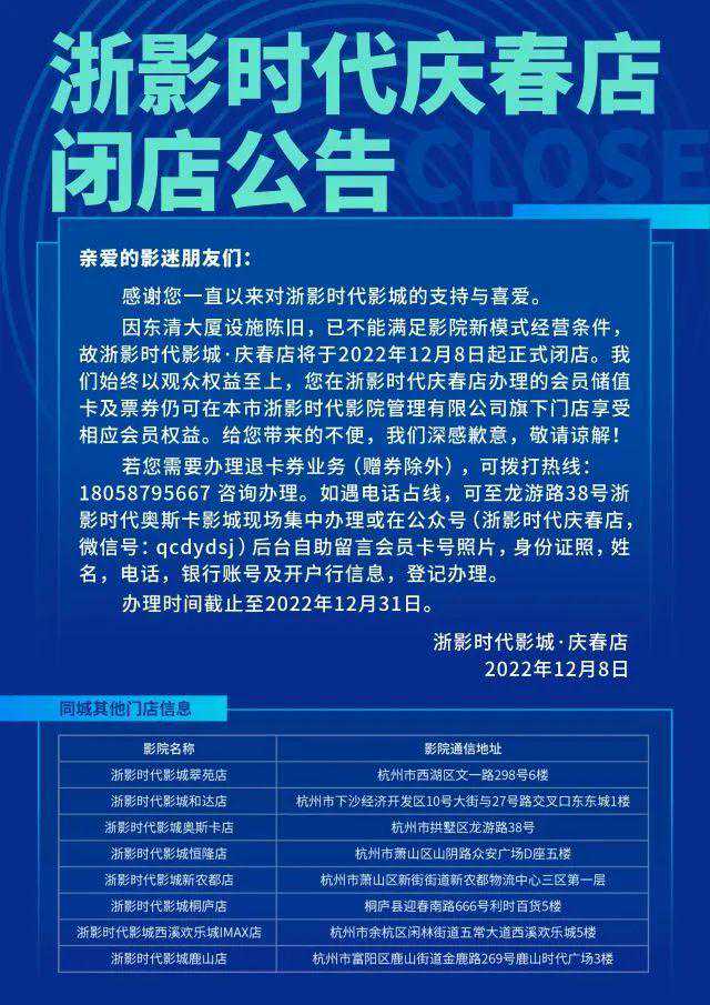 @杭州人,这家位于市中心 再见!"庆春电影大世界" 今晚,浙影时代影城·庆春店(原庆春电影大世界)在官微上发布了闭店公告,“因东清大厦设施陈旧,已不能满足影院新模式经营条件,故将于2022年12月8日起正式闭店。” 据此前消息,今年7月5日上午,杭州消防执法人员就曾来到位于杭州市拱墅区的东清大厦。经查该单位整体情况不容乐观,特别是消防管理方面存在大量隐患问题。 根据公告,观众之前在浙影时代影城·庆春店办理的会员储值卡及票券仍可在本市浙影时代影院旗下的门店,享受相应会员权益,如需办理退卡业务(赠券除外),可至龙游路的浙影时代影城·奥斯卡店现场办理或通过电话、公众号办理。 1999年8月8日开业的浙影时代影城·庆春店,曾是中国第一家多厅电影超市模式经营的影院,也是全城第一家引入4D厅的影院,最辉煌时曾连续八年名列全省影院票房和观众人次双项冠军。 有市民从小看到大 网友:我的青春结束了 这家老店也曾是这座城市的潮流风向标,多少杭州人曾在这里谈过恋爱,多少电影剧组曾在这里打过卡。 家住城东的老杭州杜先生告诉我们,这家电影院记录了他童年—青春—成年的成长历程:读初中时,在周末就经常和班里的同学来这家电影院看大片;上大学了和女朋友到庆春电影大世界约会过;如今已成家立业,还偶尔会带着孩子到这里看动画电影。现在突然宣布关店,一时间五味杂陈,感觉太可惜了。 还有市民留言:“我记得高中那会儿,周末会经常去庆春电影大世界看电影,那时看电影大概20块钱!可以说电影承包了我所有整个高中时代!是我青春最美好的回忆! 微博、朋友圈里,不少网友市民唏嘘:我的青春结束了! 再见!庆春电影大世界 诚意出品