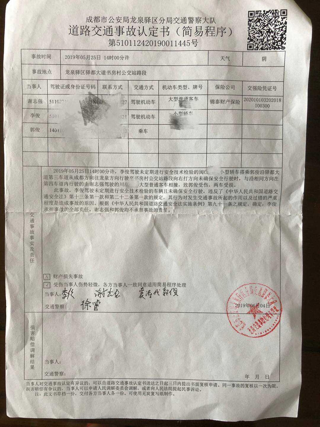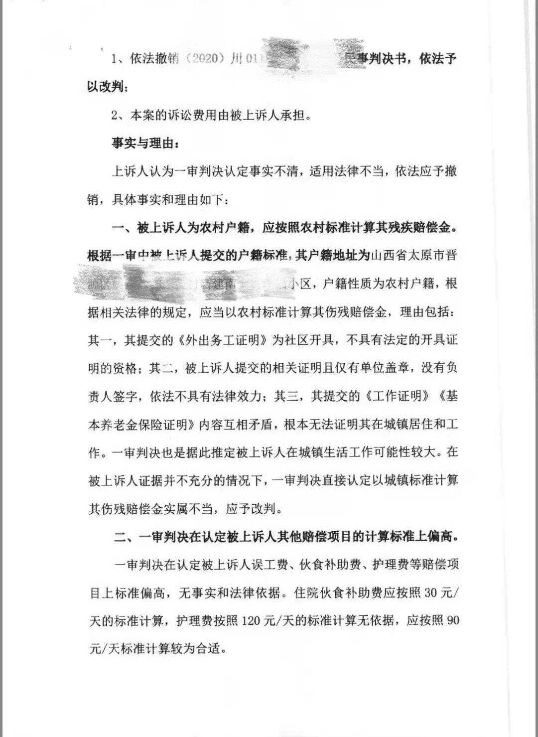 封面新闻记者钟晓璐 2019年5月,郭俊和朋友受成都颁锦企业管理有限公司(以下简称颁锦公司)之邀前往考察品牌。途中,公司负责接待员工驾驶的小轿车追尾公交车,造成郭俊中型内开放颅脑损伤,住院治疗17天,休养近3个月,经鉴定伤残等级为10级。 住院期间,颁锦公司垫付了部分医疗费26431.4元。出院后,郭俊表示这家公司再也没有联系过他,在医院期间负责跟他对接的工作人员,也将其微信好友删除。法院判决该公司赔偿郭俊8万余元,但对方公司以“误工费、伙食补助费、护理费等标准过高”为由,提起了上诉。 “法院判决一天50元的伙食费,对方说标准过高,请求改为一天30元,一个公司怎么能说出这么没有人性的话,对于一个病人来说,30元一天的伙食费合理吗?”郭俊告诉记者,目前尚未收到开庭通知,希望能早日收到赔偿款。 郭俊乘坐成都颁锦公司的车前往考察遭遇车祸 乘坐公司车辆考察遭遇车祸鉴定为伤残10级 郭俊为听障人士,2019年他本打算拿出自己的积蓄,和朋友一起在重庆开一家奶茶店。每年夏季是茶饮销售的旺季,2019年,郭俊准备在夏季来临前开店。开店前,郭俊四处考察品牌,了解行情。 2019年5月25日,郭俊和朋友受到颁锦公司的邀请,前往成都考察。两人从成都东站出站后,坐上了由该公司安排的一辆小轿车,司机为李俊。 车辆在行驶至成都市龙泉驿区驿都大道书房村公交站时,与前方的公交车相撞。“我当时坐的后排,只感觉两眼一黑。”据郭俊介绍,自己头部被撞出了长达10余厘米的口子,鼻子口腔一直流血,之后被120急救车送往医院进行治疗。 交通事故认定书 出院病情证明书显示,郭俊诊断为中型内开放颅脑损伤。经鉴定,伤残等级为10级。龙泉驿区公安分局交警大队作出的交通事故认定书显示,司机李俊为全责。 郭俊先后在成都市龙泉驿区中医医院、四川省人民医院住院17天。据他介绍,住院期间都是朋友负责护理自己。“对方公司工作人员来过几次,垫付了两万多元的住院费用,但是出院之后就再也没有人联系我。”出院后,医生要求郭俊在家休养三个月,并定期进行复查。“每次联系他们时,对方都不配合,复查、司法鉴定都是我自己去弄的”。郭俊表示,自己一个山西太原人,此前一直在重庆工作,在成都人生地不熟,事故发生以来,前前后后奔波了10余次,每次都是无功而返。 法院判决书 法院判赔8万余元涉事公司上诉:伙食补助费过高 无奈之下,郭俊到法院起诉了李俊及颁锦公司,由于李俊是颁锦公司员工,事故发生时是李俊的职务行为,这辆车颁锦公司从别处借用,没有保险没有定期进行年检,法院判决颁锦公司赔偿郭俊损失共计83774.4元。 判决下来后,颁锦公司不服,向成都中级人民法院提起了上诉。该公司认为,郭俊为农村户籍,应按照农村标准计算其残疾赔偿金,同时,该公司指出郭某误工费、伙食补助费、护理费等赔偿项目上标准过高。 颁锦公司的上诉状显示:郭俊住院伙食补助费应该按照30元每天的标准计算,护理费应按照90元每天的标准进行计算。 成都颁锦企业管理有限公司提交的上诉书 “法院判决一天50元的伙食费,对方说标准过高,要求改为一天30元,一个公司怎么能说出这么没有人性的话,对于一个病人来说,30元一天的伙食费合理吗?”郭俊表示,自己受邀来这家公司考察,途中因为司机的原因发生车祸,自己受伤住院,但出事后,对方却是这种态度,无论从哪个层面自己都无法接受。 封面新闻记者查询到,成都颁锦企业管理有限公司是一家从事奶茶饮品品牌孵化的公司,法定代表人为陈明明,注册资本为200万元。记者多次尝试拨打成都颁锦企业管理有限公司电话,均无法接通。 记者联系到曾在郭俊住院期间负责对接公司员工李先生,对方表示,自己在去年4月份已离职,对于公司后续处理情况并不知情。 参与方式 4、您还可以拨打热线028—86969110,进行求助。 所有求助内容,经编辑审核通过后,即视为发布成功。 封面新闻将24小时实时解答、跟进,并提供相关协助(为保护隐私,相关信息将会保密,请放心)。 【如果您有新闻线索,欢迎向我们报料,一经采纳有费用酬谢。报料,报料QQ:3386405712】
