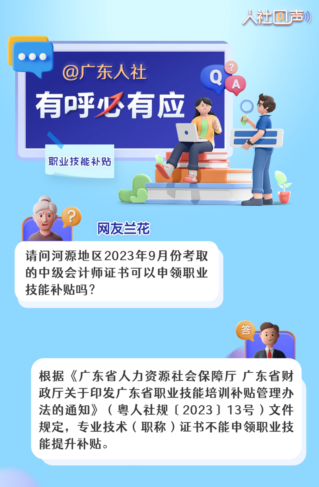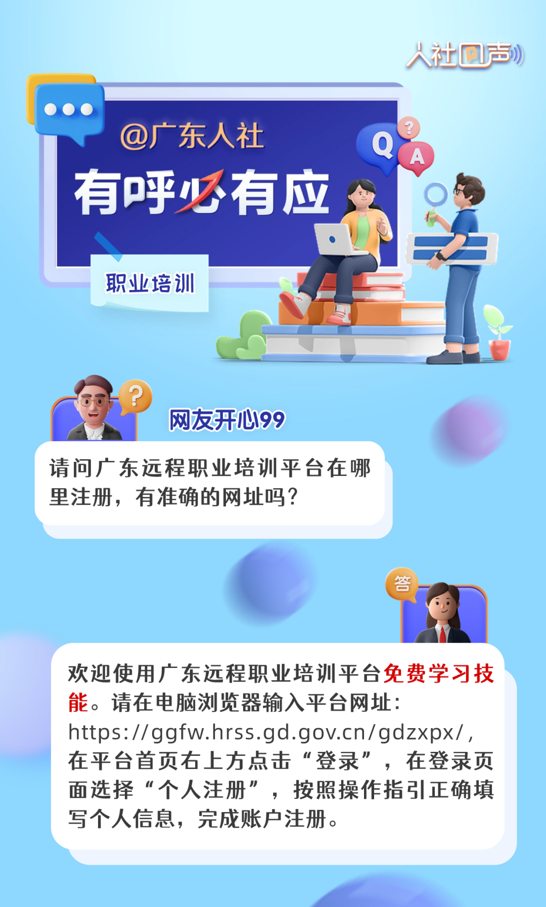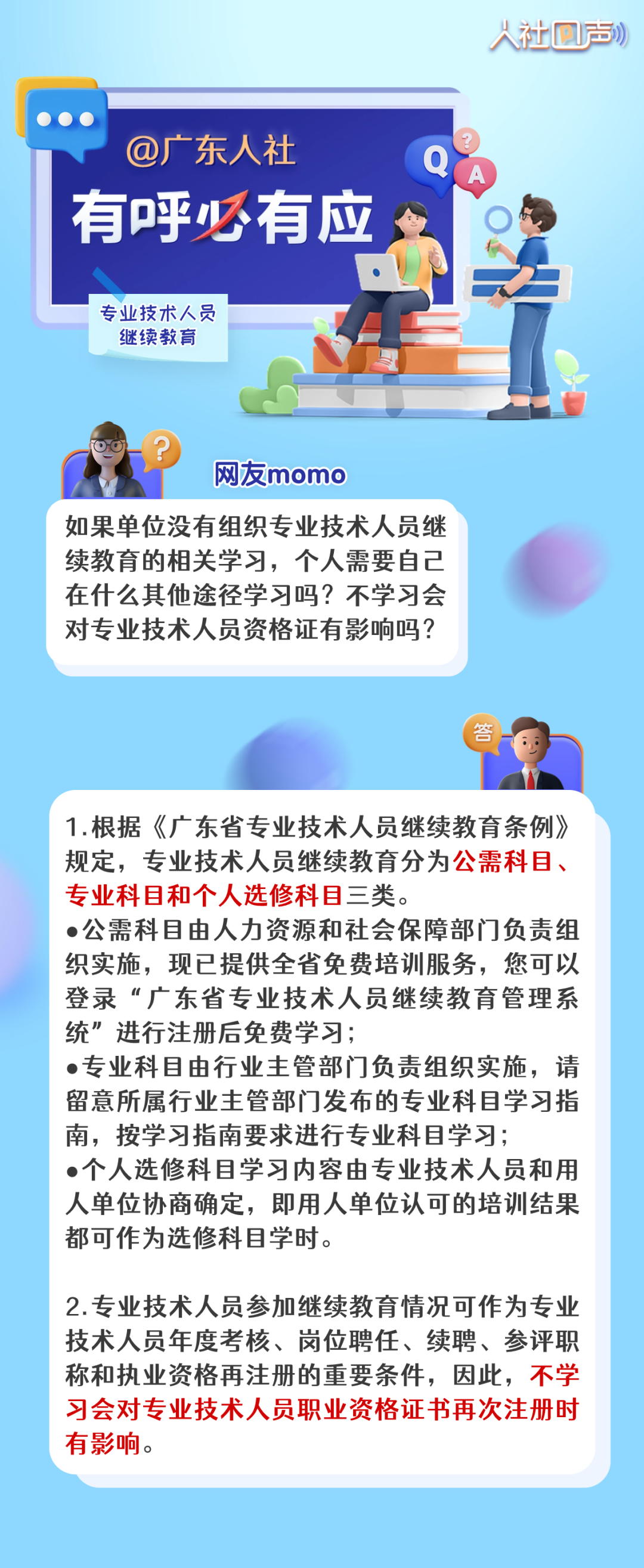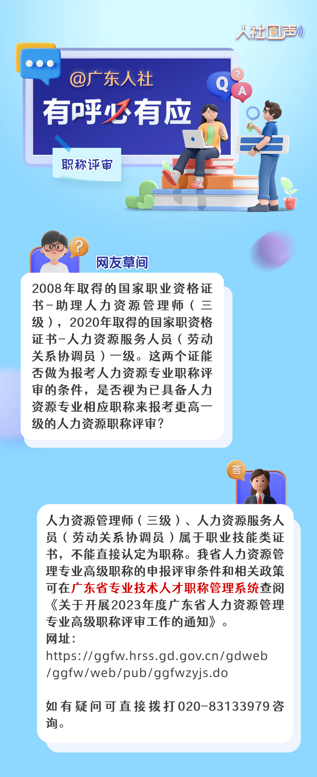 编者按 着眼“民”问题,互动“零”距离。为着力解决群众急难愁盼问题,把惠民生的事办实、暖民心的事办细、顺民意的事办好,广东人社于每周五推出《人社回声》栏目,聆听大家的心声,精选公众号留言进行答复,解答有关就业创业、社会保障、人才人事、劳动关系等领域的问题。 人力资源管理师(三级) 可以申请高级职称吗? 个人如何参加专业技术人员继续教育? 不参加会有影响吗? 您的问题已收到 《人社回声》第四十四期为您解答! 广东省专业技术人才职称管理系统网址(长按可复制): 广东远程职业培训平台网址(长按可复制): 广东省专业技术人才职称管理系统网址(长按可复制): 你还关心哪些问题? 留言区等你 下周五继续不见不散!
