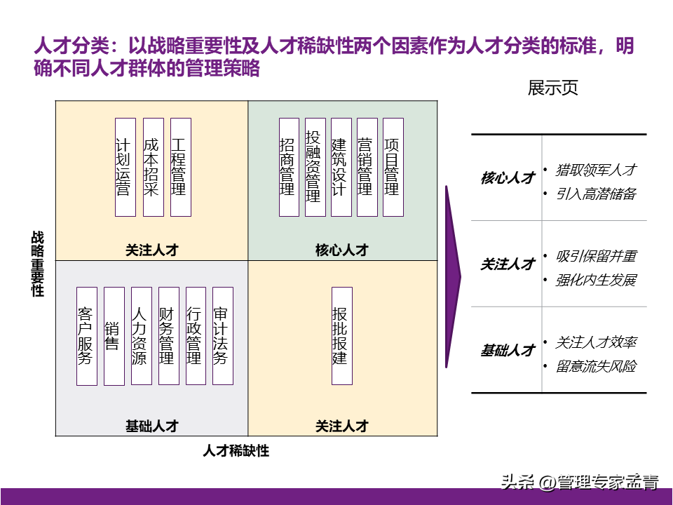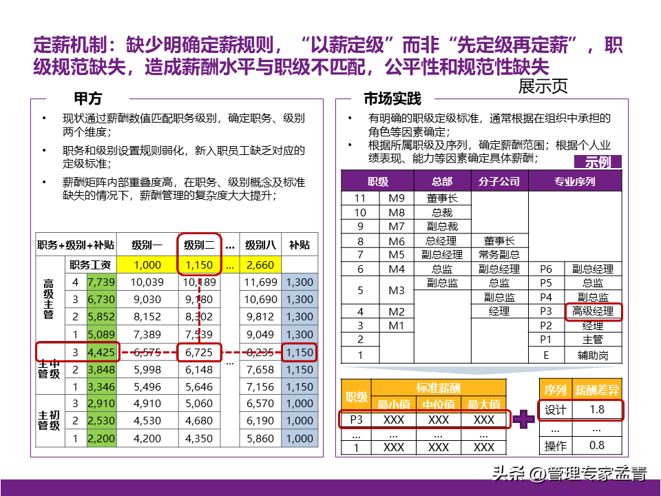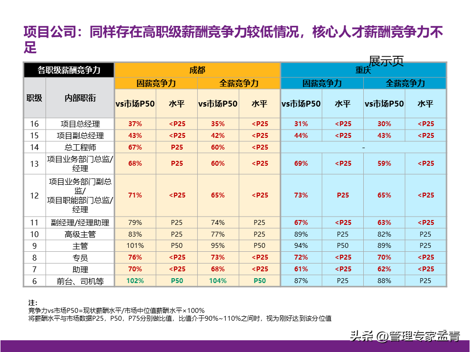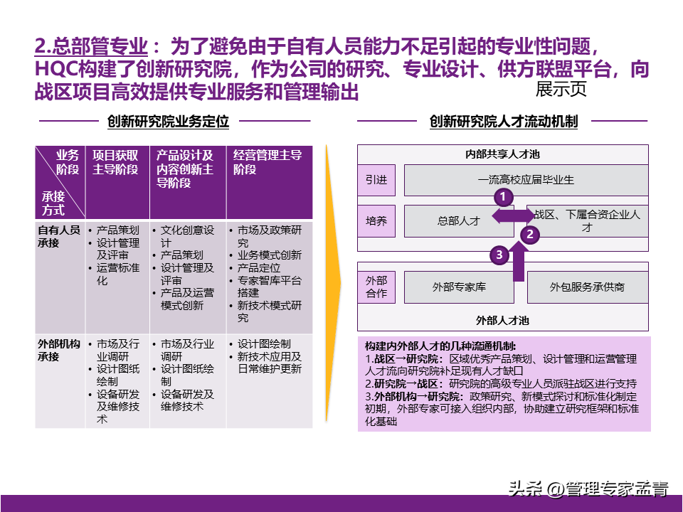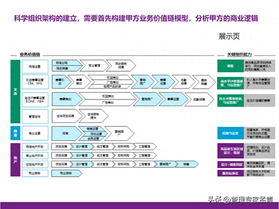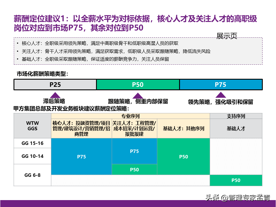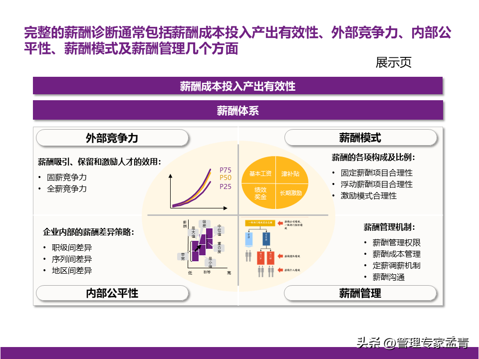 随时更新的资料课件、读书笔记、行业报告、工具模板等精选学习材料; 提供世界顶级咨询公司近两年出品的交付版管理咨询方案/报告、经营管理指导手册与内训课程等; 为企业经营管理者打造综合性专业知识库、持续赋能组织发展与个人成长。 管理概要: 一、公司战略 公司有清晰的战略目标,具备独特商业模式和组织竞争力,需要进一步对战略目标的实现路径进行系统性的思考; 为匹配业务拓展的背景,需进一步思考适合核心高管“释放日常管理、聚焦战略安排”的管理模式。 二、组织管控 组织职责基本完整,部门间的职责边界、管理权限、配套措施有进一步梳理和提升的空间; 在业务提升的过程中,公司需要补充“定规范、管标准”类的职责,以实现能力的共享和输出; 公司组织管控的优化需要综合考量风险管控、资源整合、工作效率,逐步实现管理的相对平衡。 三、薪酬 对于现有薪酬水平,管理层中存在不同的声音,需结合市场薪酬数据做进一步的分析和讨论; 在薪酬管理机制方面,公司可以从定薪、调薪、薪酬沟通三个方面考虑优化和提升。 四、绩效 考核激励是牵引组织完成其使命和定位的有效拉动手段,组织绩效体系需要匹配战略目标实现路径,优化考核导向与考核重点,发挥战略指挥棒的作用;员工绩效体系需承接相应的组织绩效; 在绩效体系的后端应用方面,绩效考核结果需进一步挂钩奖金确定、职级调整、薪酬调整等应用,做实绩效管理体系在日常管理中发挥的作用。 本文下载方法:
