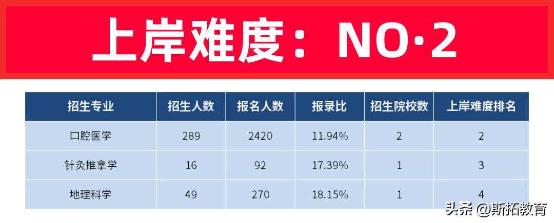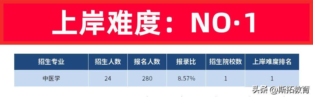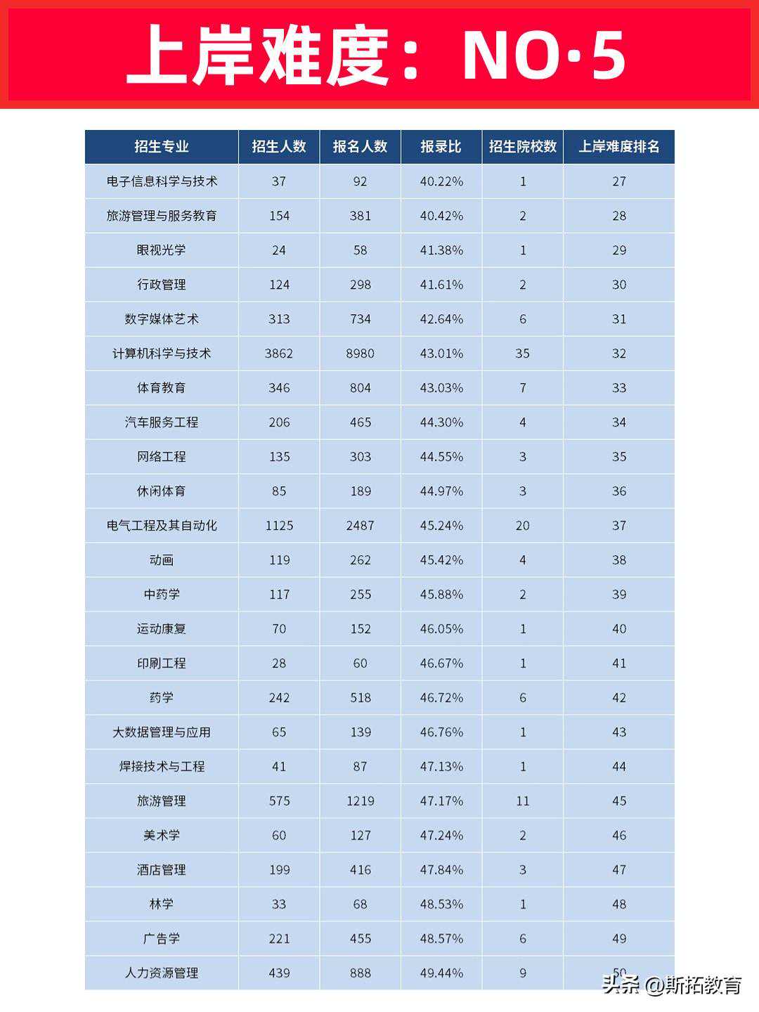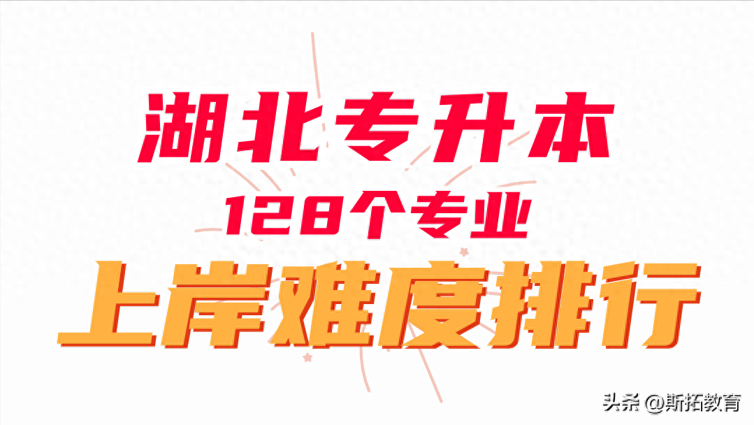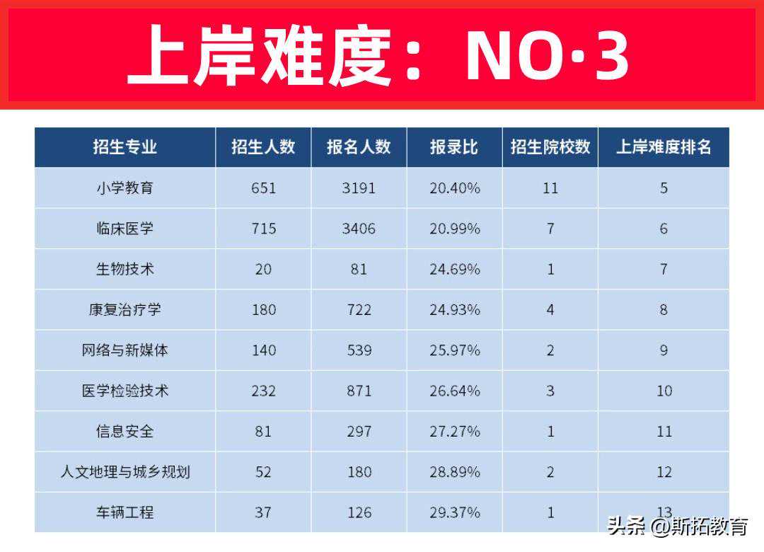 2023年湖北普通专升本招生专业128个,斯拓专升本以综合录取率划分10个梯队 由于篇幅较长,分为上篇和下篇展示 看看你的报考专业,在哪个梯队?竞争力有多大? 以下以普通考生为例,为大家解析 上岸难度:五颗星 专业分析:中医学专业是湖北普通专升本128个专业中,上岸难度排名第一,是蕞卷的专业,招生人数仅招24人,报录比8.57%,12人报名,1人录取。 中医学专业招生院校仅有1所--湖北中医药大学,是湖北唯一一所中医学公办本科院校 考试科目:大学英语+中医基础理论 参考教材:全国高等中医药院校规划教材,新世纪第四版,郑洪新,中国中医药出版社 上岸难度:四颗星 专业分析:在第二梯队中,口腔医学、针灸推拿学、地理科学,其中,口腔医学专业报名人数2420人,近几年备受医学生追捧,招生院校仅有2所,招生院校:湖北科技学院、荆楚理工学院;针灸推拿学专业招生仅16人,录取率:17.39%,招生院校:湖北中医药大学;地理科学专业招生人数49人,招生院校:湖北文理学院;这个梯队的录取率不超过20%,竞争非常大。 上岸难度:三颗星 专业分析:在第三梯队中,共有9个专业,以小学教育、临床医学专业,深受考生追捧,报名人数3000+,录取率20%左右,5人报名,1人录取,也是近几年湖北专升本比较内卷的专业之一。 上岸难度:二颗星 专业分析:在第四梯队中,共有13个专业,以护理学、学前教育、汉语言文学、法学、物联网工程专业是备受考生欢迎的,报名人数破千人,其中,护理学,学前教育,专业报名人4000+,汉语言文学专业突破3000+,也是近几年内卷的专业之一。 在这13个专业中: 护理学,招生院校:15所 学前教育,招生院校:19所 汉语言文学,招生院校:16所 法学,招生院校:9所 物联网工程,招生院校:7所 在这个梯队中,录取率不超过40%,2-3人报名,1人录取,竞争相对较大。 上岸难度:一颗星 专业分析:在第五梯队中,共有24个专业,其中,计算机科学与技术、电气工程及其自动化、旅游管理专业报名人数破千人,计算机科学与技术专业,报名人数近9000人,占总报名人数的10%左右;其次,电气工程及其自动化专业报名人数近2500人,也是湖北专升本主力专业之一。 在这个梯队中: 计算机科学与技术,招生院校:35所 电气工程及其自动化,招生院校:20所 旅游管理,招生院校:11所 下期为大家分享2024年湖北专升本,128个专业上岸难度排行榜下篇。