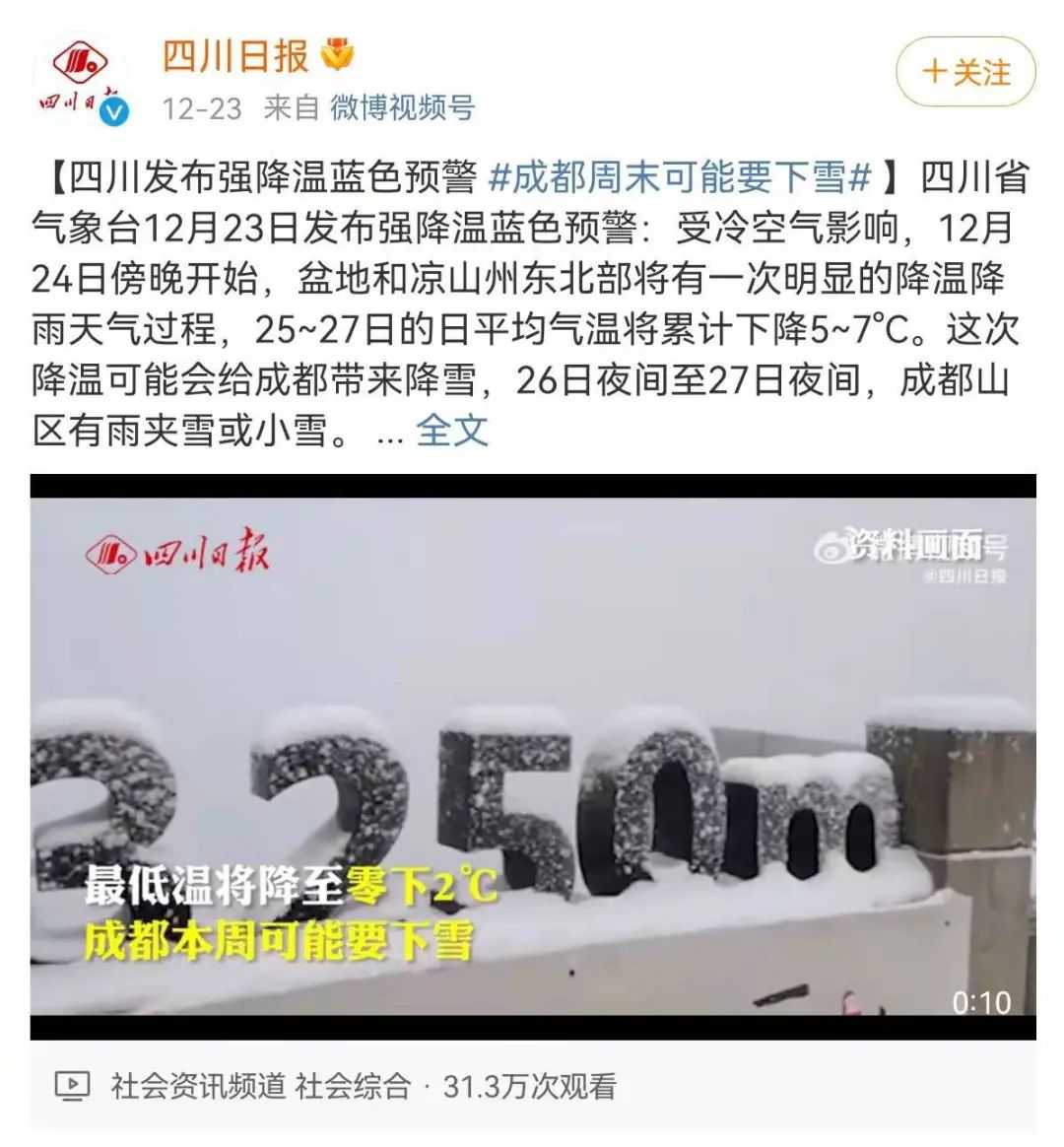 这两天 全网都在说成都下雪了 但这雪更像薛定谔的雪 愣是没瞅见 翻遍全网才发现 原来今年成都的初雪如此金贵 得5.2的视力 才能有机会得以窥其全貌 事情的发生 还得从4天前说起 虽然气温大跳水 但是这则关于周末下雪的预言 却激起了全成都的兴奋 虽然个个嘴上说着不信 但早就付诸行动做好了准备 静静等待雪的到来 果然它没来 不过 不知是头天晚上成都人的心太诚 还是“怨念太大” 周六睁开眼 就开始有网友说自己 ❄找!到!雪!了!❄ 只是这雪 多少跟想象中的不太一样 图据@爱拍照的小飞 这已经不是小的问题了 图据@哆啦A梦的跟屁虫 这简直就是敷衍 如果一定要总结陈词 那大概就是 全国人民看雪 成都人民看冰晶 去年打着手电找雪的经历 还历历在目 今年 直接开启放大镜模式 上一秒 还在为找到了而欢天喜地 下一秒就消失在了人海 但即便是这样 也足够令人“耀武扬威”了 毕竟有些人 就像雪地里的猹 上窜下跳也愣是啥没看到 冷倒是冷的很平均 但雪呢? 有人32倍放大镜找雪 有人朋友圈里求雪 还有人下定决心一定要看到 真正的雪 驱车俩小时也要和雪留个念 去青城山看红墙白雪 图据@随身携带小饼干 去彭州宝山太阳湾林中漫步 去崇州看雪满枝头 去邛崃过悠闲周末 和都江堰的朋友煮茶吟诗 图据成都范儿 爬龙泉山顶打卡地标 图据微成都 去西岭雪山运动一下 图据@西岭雪山景区 哪也不想去的朋友 则选择了在家耐心作画 其实纵观往年 1月才是成都下雪的高潮期 所以 咱再给雪它点时间 让它再飘会儿 找雪乐归乐 但是大家一定要注意保暖! 据成都气象台预报 28日晚上到29日白天 最低气温低至-3℃! 天气冻人 小伙伴们做好防护哦!