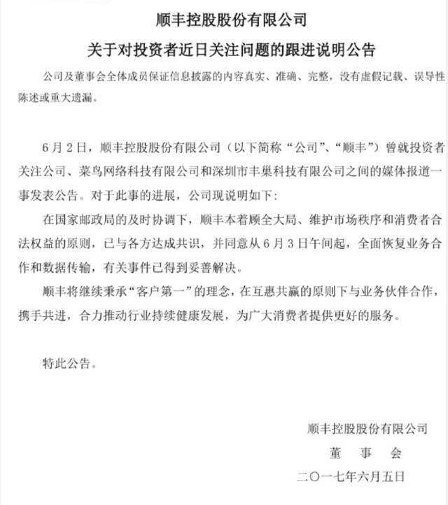 顺丰控股6月5日公告称,在国家邮政局的及时协调下,顺丰本着顾全大局、维护市场秩序和消费者合法权益的原则,已与各方达成共识,并同意从6月3日午间起,全面恢复业务合作和数据传输,有关事件已得到妥善解决。